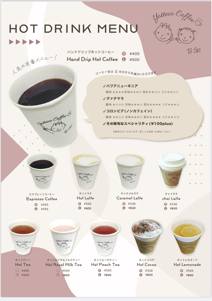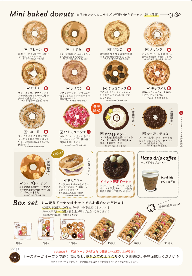 _yotteco coffee_, located in the heart of Osaka, specializes in freshly baked mini donuts that are as delightful as they are nutritious. The highlight of their menu is the **オードブルドーナツ**, perfect for sharing at parties or gatherings, allowing customers to select from a variety of flavors. With 15 types of donuts, including seasonal specialties, there’s a taste for everyone, priced at just JP¥120 each.